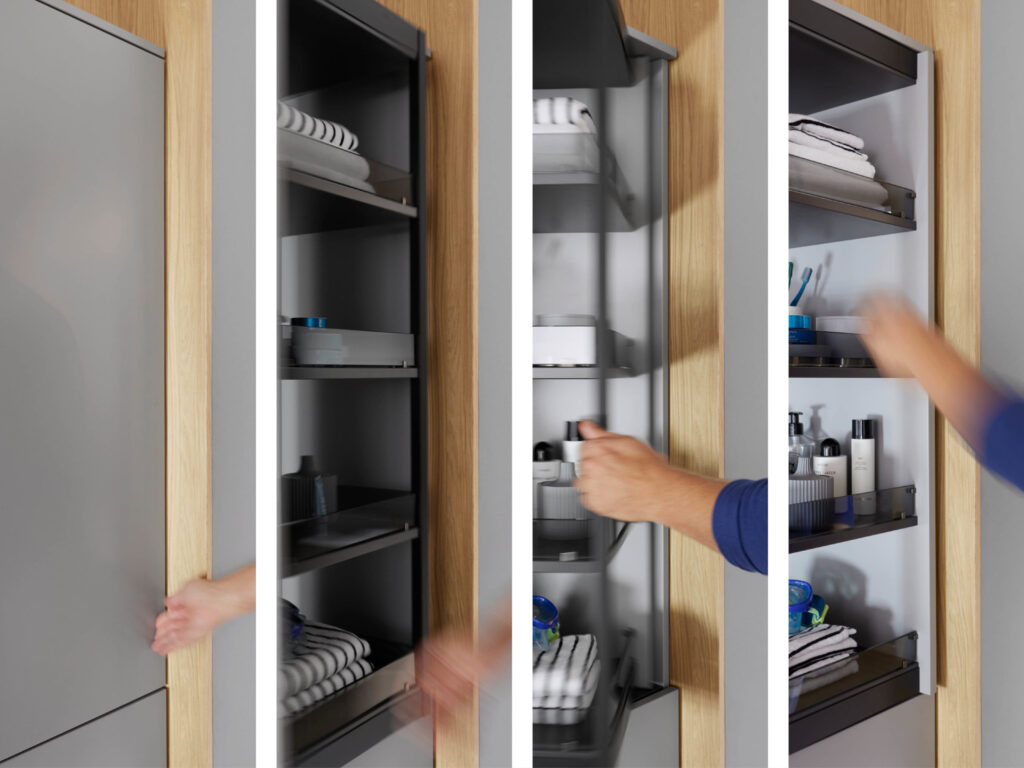 Der neue Hochschrank MagicTwist von burgbad schafft spielend Platz auf kleinstem Raum: Dank eines neuen Drehbeschlags verwandelt sich ein geschlossener Schrank im Handumdrehen in ein offenes Regal – und umgekehrt. So wird der Raum bis in den hintersten Winkel perfekt genutzt, ohne dass dabei Türen im Weg stehen.